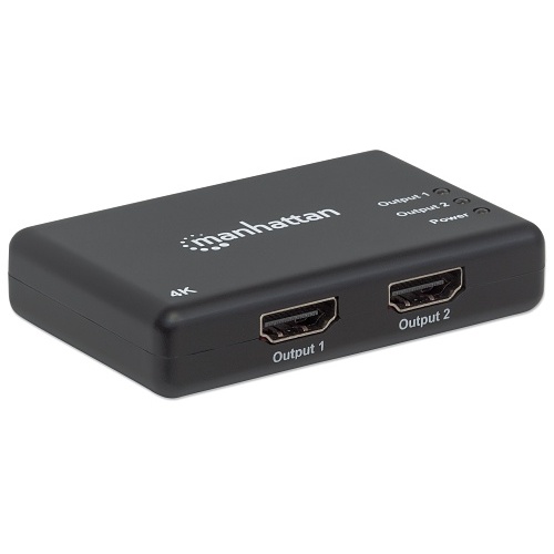 Easily distribute a single Ultra-High-Definition (UHD) signal to multiple displays . The Manhattan 4K 2-Port HDMI Splitter with built-in booster streams a 4K HDMI signal from a single UHD source to up to two UHD displays. . Flexible Solution for Many A/V Applications . Ideal for trade shows, classrooms, video conferencing, home theater, presentations and retail applications, the Manhattan 4K HDMI Splitter features a built-in booster for added signal strength. It's a good choice for splitting and distributing a synchronous signal to multiple 4K HDMI displays when source equipment is remotely stored in a secured room or cabinet. Cascade multiple units up to three levels to output HDMI video/audio on additional displays in widely distributed applications. . Quality Construction and Easy Installation . Full compliance with HDMI, HDCP 1.4 and DVI 1.0 ensures that the Manhattan HDMI Splitter can provide long service and reliable performance. Quickly connect HDMI cables (not included) and the AC power adapter, and this affordable UHD solution is complete - no software/hardware configuration or complicated settings required.