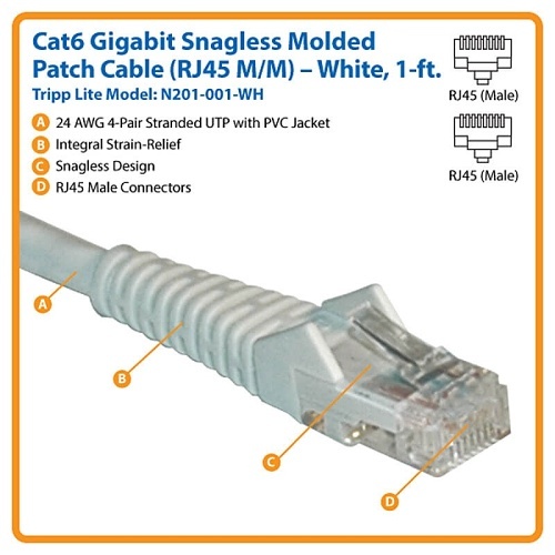 Eaton Tripp Lite N201-001-WH CAT6 Snagless Molded Gigabit Patch Cable, UTP, RJ45 M/M, 1' (30.5cm), White